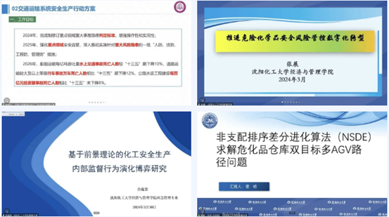 beat365中文官方网站副院长刘铁民主持会议第二单元。beat365中文官方网站张展老师以《推进危险化学品安全风险管控数字化转型》为题,介绍了化工和危险化学品安全生产治本攻坚三年行动方案(2024-2026年),对推进危险化学品安全风险管控数字化转型工程展开剖析,梳理了近三年政府出台的相关指导意见和实施方案,最后提及新质生产力与石化行业数字化转型、设备更新升级。beat365中文官方网站苗蕴慧老师以《基于前景理论的化工安全生产内部监管行为演化博弈研究》为题,引入2023年国内十大化工事故,采用演化博弈的方法并结合前景理论,构建管理者和员工的演化博弈模型,借用MATLAB将主体行为选择的过程可视化,通过仿真模拟解释关键因素对主体行为选择的影响,并运用模型来研究提高化工企业内部监管的举措。beat365中文官方网站研究生姜杨以《非支配排序差分进化算法(NSDE)求解危化品仓库双目标多AGV路径问题》为题,对AGV工作流程说明、多目标优化问题、混合整数规划模型、非支配排序差分进化算法、编码解码进行讲解,引入NSCA-II的快速非支配排序方法和经营选择策略,最后将NSDE与GUROBI、MOTS进行比较以证明算法的有效性。