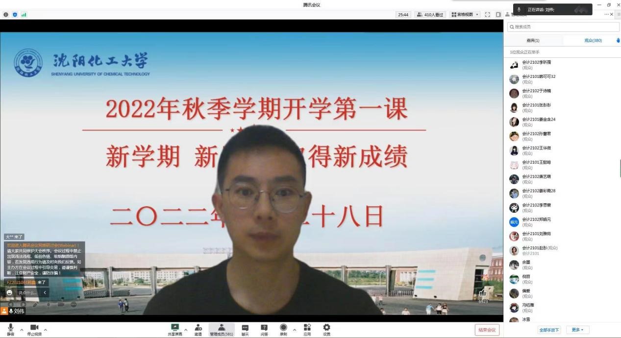 2021级研究生辅导员刘伟老师以研究生“安全教育”为切入点,提醒全体同学增强疫情防控意识,坚持做好防护措施。通过大数据分为学生们讲解当前电信网络诈骗的形式以及学生群体诈骗案件的特点,强调一定要增强安全防范意识。刘老师就学业管理、宿舍管理、奖助学金评定、创新实践项目、学术竞赛、社会实践等工作向学生做详细说明,并对同学们特别关心的问题逐一进行解答。最后刘老师嘱咐学生要积极配合学院工作,不负韶华,以扎实的学识增添生命光彩。