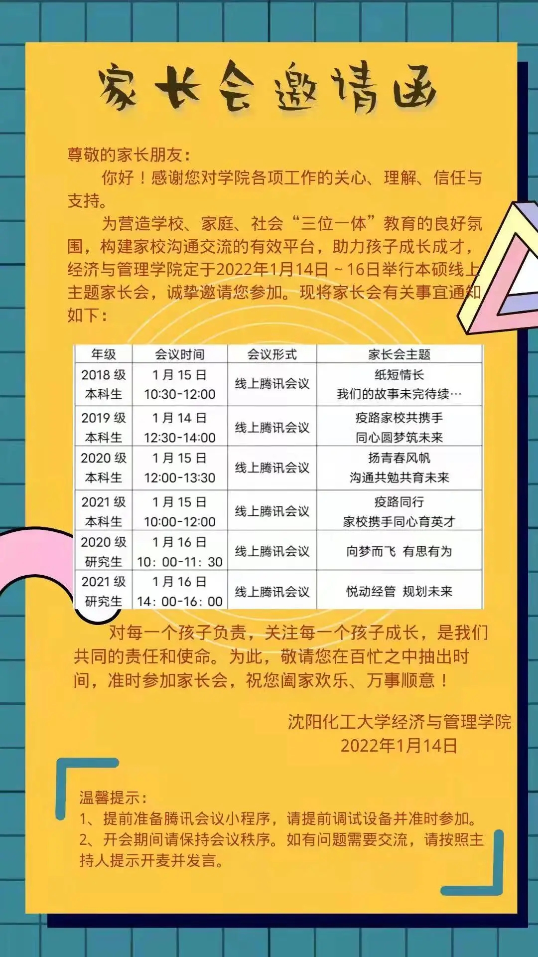 2021级新生入学刚满一学期,再次与家长网络相聚,倍感亲切。辅导员刘伟老师首先为家长介绍了2021级学生在校学习、生活情况,分享了孩子们的成长瞬间,着重强调疫情防护和假期安全。他动员学生,寒假期间,要积极参加家乡的社会实践活动,积极参加体育锻炼,注意防盗防骗等。会后,家长们纷纷在家长群内自发地分享对学校、学院、老师的感激之言。
