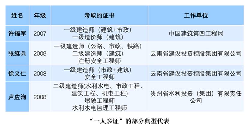 学生毕业后大量考取执业资格证书,考证热情高涨。截至2019年,已考取国家一级建造师、一级造价师等近50人,2011届、2012届毕业生一级证书通过率高达33%,甚至一人考取多项证书,二级建造师等二级证书几乎实现了专业全覆盖。