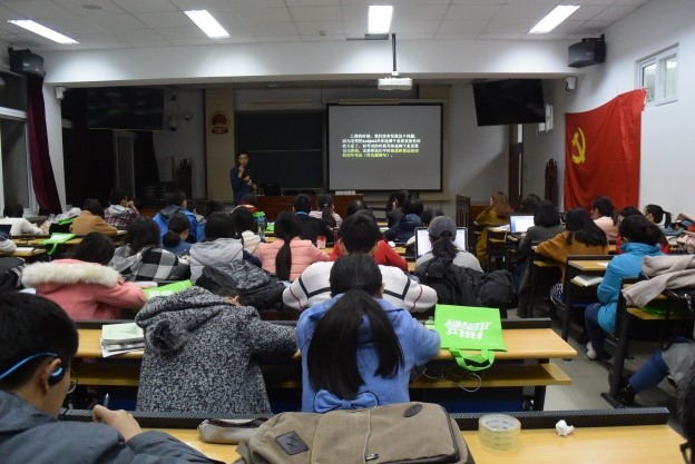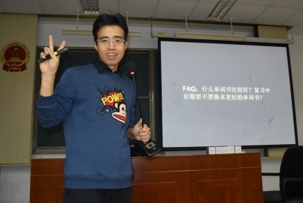 讲座开始之前首先进行了抽奖环节,有三位同学幸运地获得了新东方内部考研英语资料。讲座开始后,李剑老师从实际出发,将讲课内容分为三个部分:1、词汇基本功底2、阅读实战训练3、整体复习规划。在第一部分,李老师从一个简单的单词spring出发,阐述了如何选择优秀的单词书,并指导同学们要扩大“硬盘容量”及提高“内存速度”,即要多背单词并熟悉、积累老师整理的历年真题例句,尤其是同学们最容易遇到困难的相似易混、一词多义、根据上下文理解的部分,这样才能在阅读中快速理解词义。在第二部分,李老师教会同学们如何运用他独创的“模糊阅读法”,提高对词、句、问题、选项的分析能力。他讲到,备考阅读题最重要的是将历年阅读真题连续做三遍,将初读、精读、参考解析相结合。第三部分,李老师为同学们做了微观时间安排,即先单词,后翻译与写作,全程跟进阅读,兼顾完型与新题型,针对备考的不同阶段规划单词与阅读的训练量,并鼓励我们寻找一个学习上、生活上的伙伴,相互关心,共同进步。讲座结束后,工作人员收集意愿申请表,并从中抽取十名同学,奖励了考研复习资料以及玻璃水杯。老师与所有参加讲座的同学合影留念。
